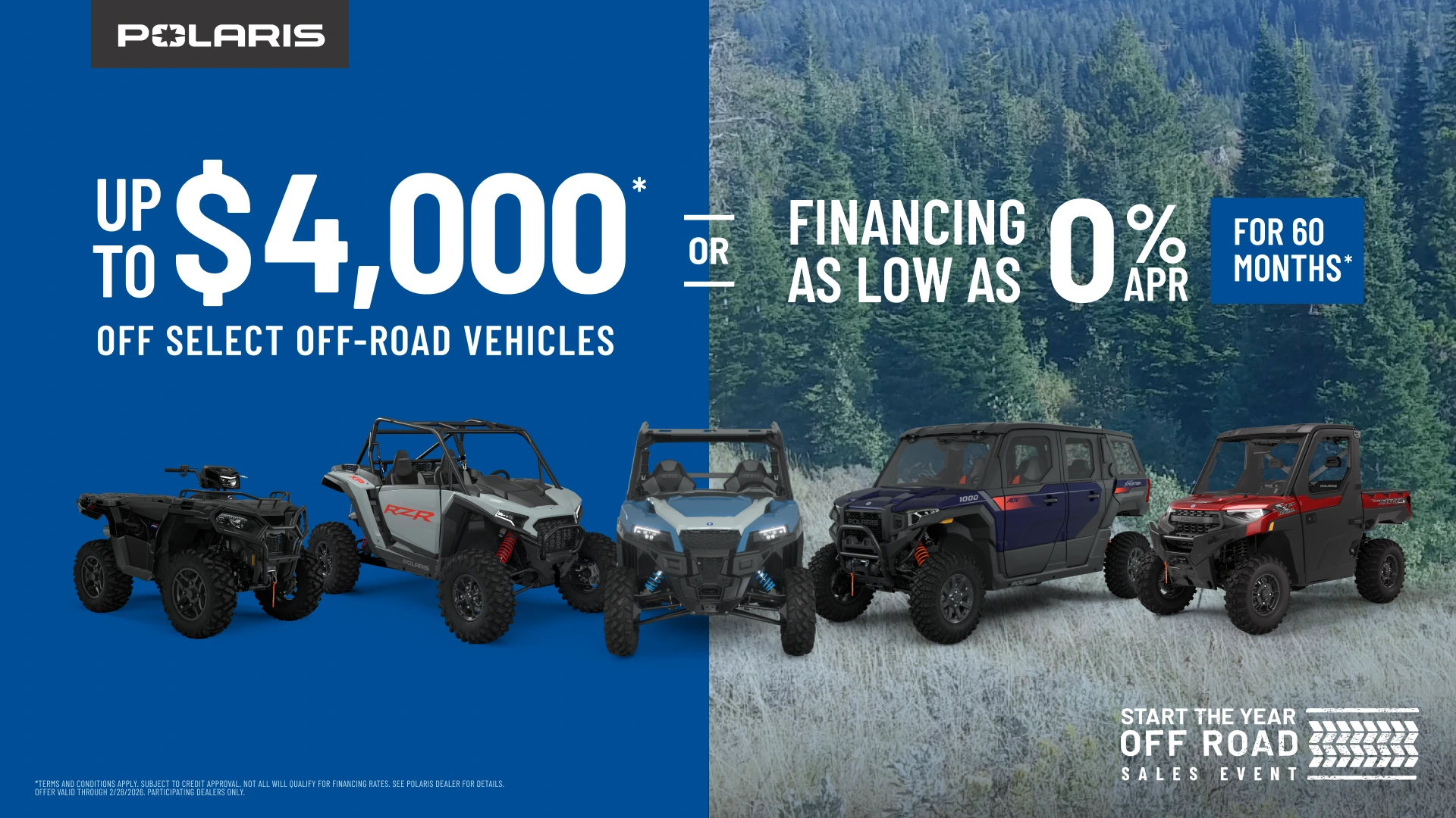 *Rebates available on select new and unregistered 2024 - 2026 Sportsman, Scrambler, RANGER, RZR, GENERAL and Polaris XPEDITION models purchased between 1/1/2026 - 2/28/2026.