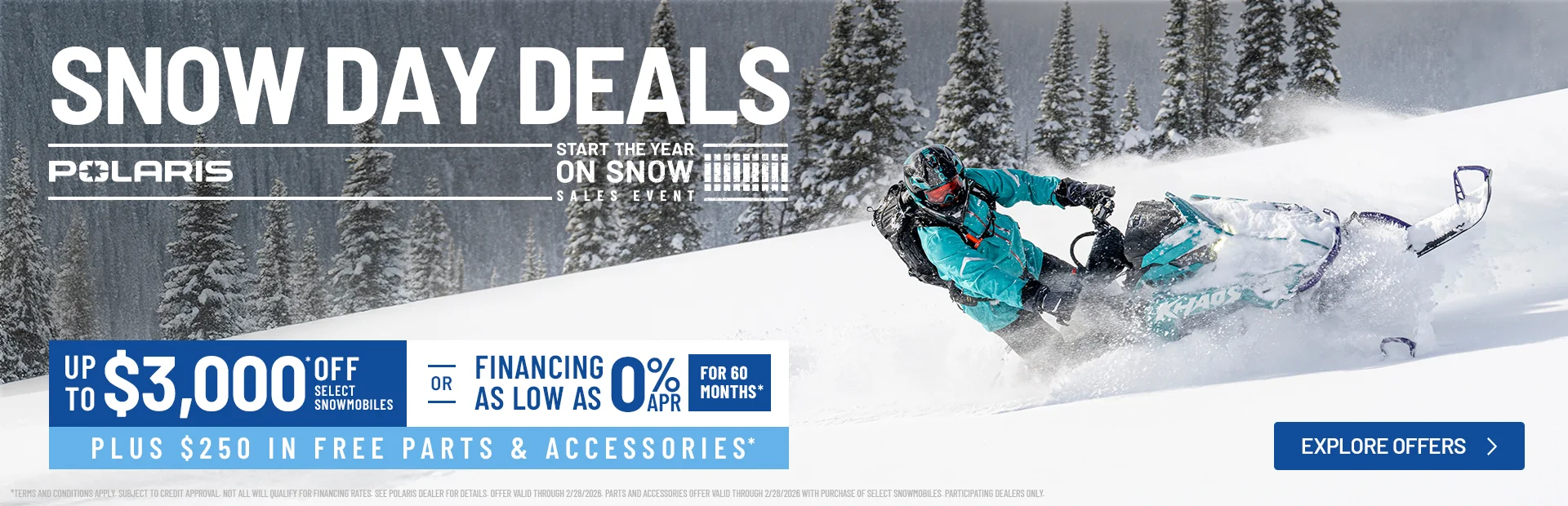**Promotional finance offers (rates as low as 0.00 % for 60 months) valid on only select new 2024-2026 model Polaris snowmobiles purchased from participating authorized U.S. Polaris Snowmobile dealers between February 1st, 2026 – March 31st, 2026. Minimum payments required. Offer may not be combined with certain other offers, is subject to change and may be extended or terminated without further notice. Model specifications subject to change. Model & year exclusions apply. See your local dealer for details. This special finance offer is in lieu of any rebate offers.
